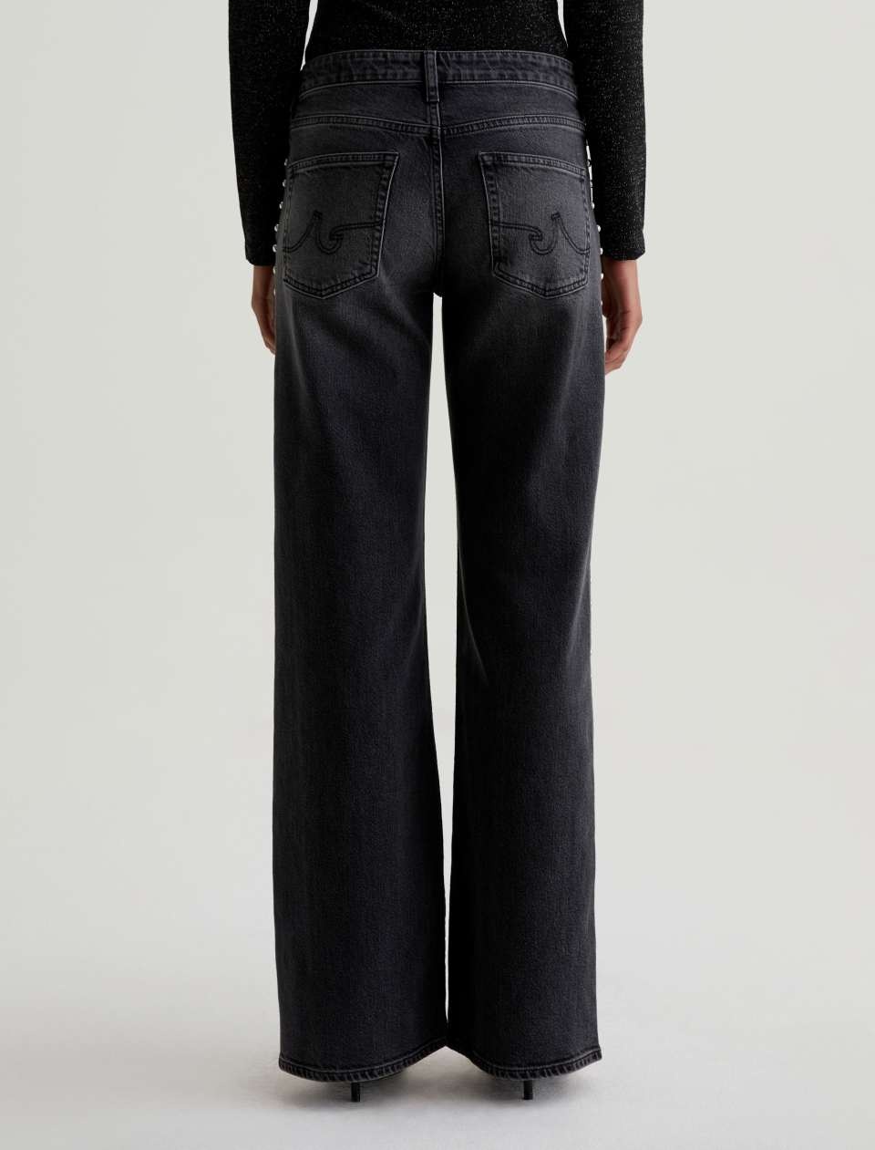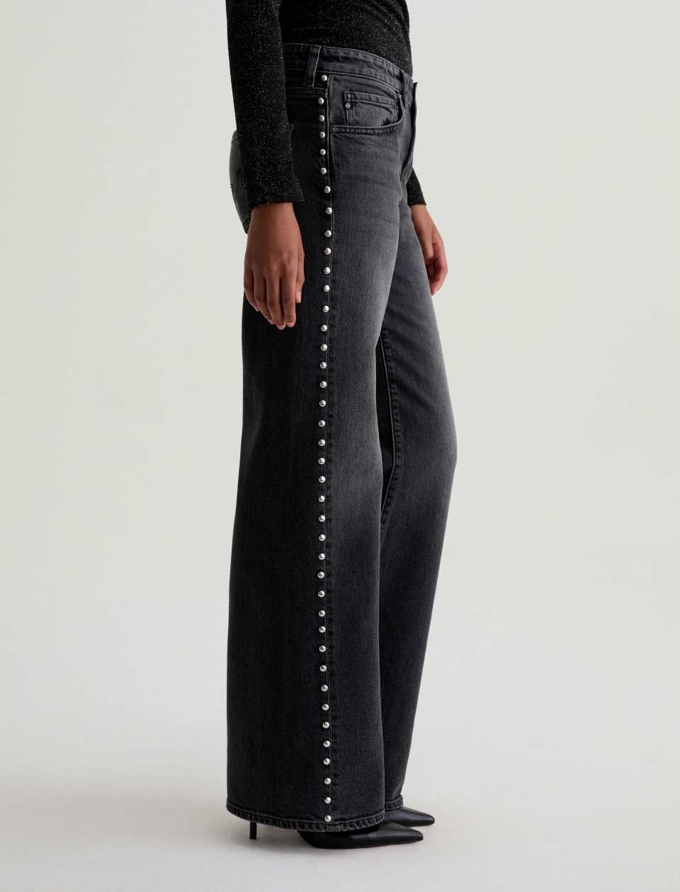 Adria Studded is crafted from Black Comfort Denim with a low-rise waist and a loose wide leg that puddles at the hem. Embellished with round metal studs along the side seam for a contemporary edge. The ultimate statement jean for fall.