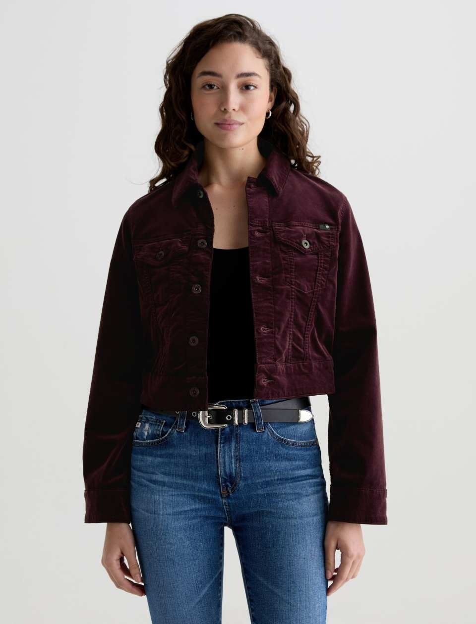 The Isa Jacket is a modern trucker cut for a straight, cropped fit with bell-shaped sleeves. Stretch Velvet for superior comfort and style. Classic flap pockets, front placket with metal hardware, and button tabs at the waistband.