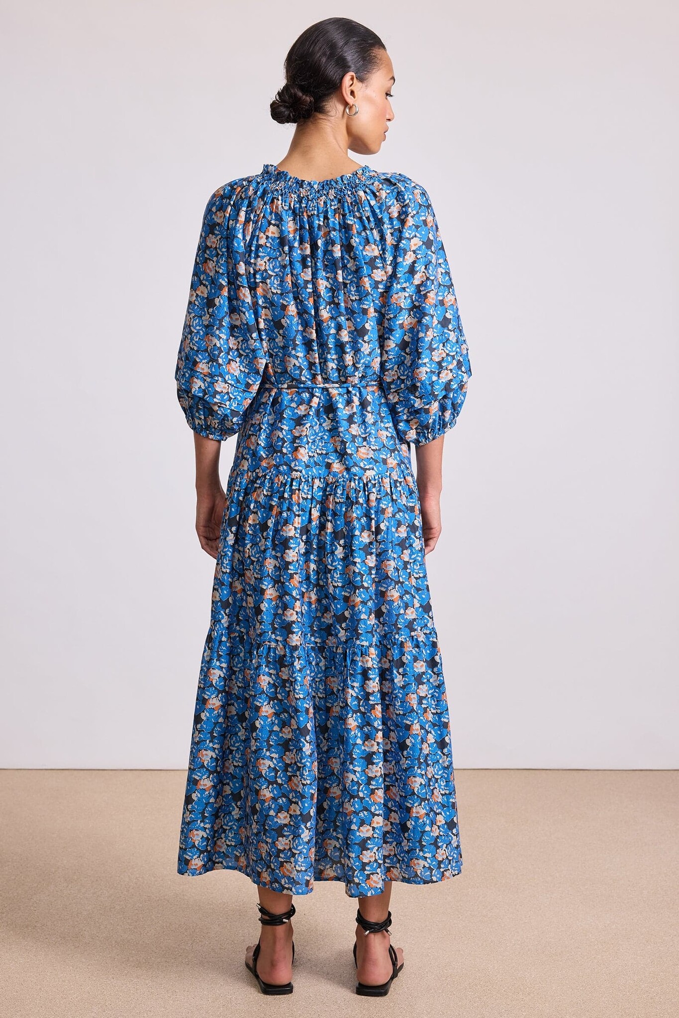 - V neckline, hand stitched smocking around the neck, 3/4 length lantern sleeve with elastic at opening, voluminous silhouette, removable self-tie waist belt