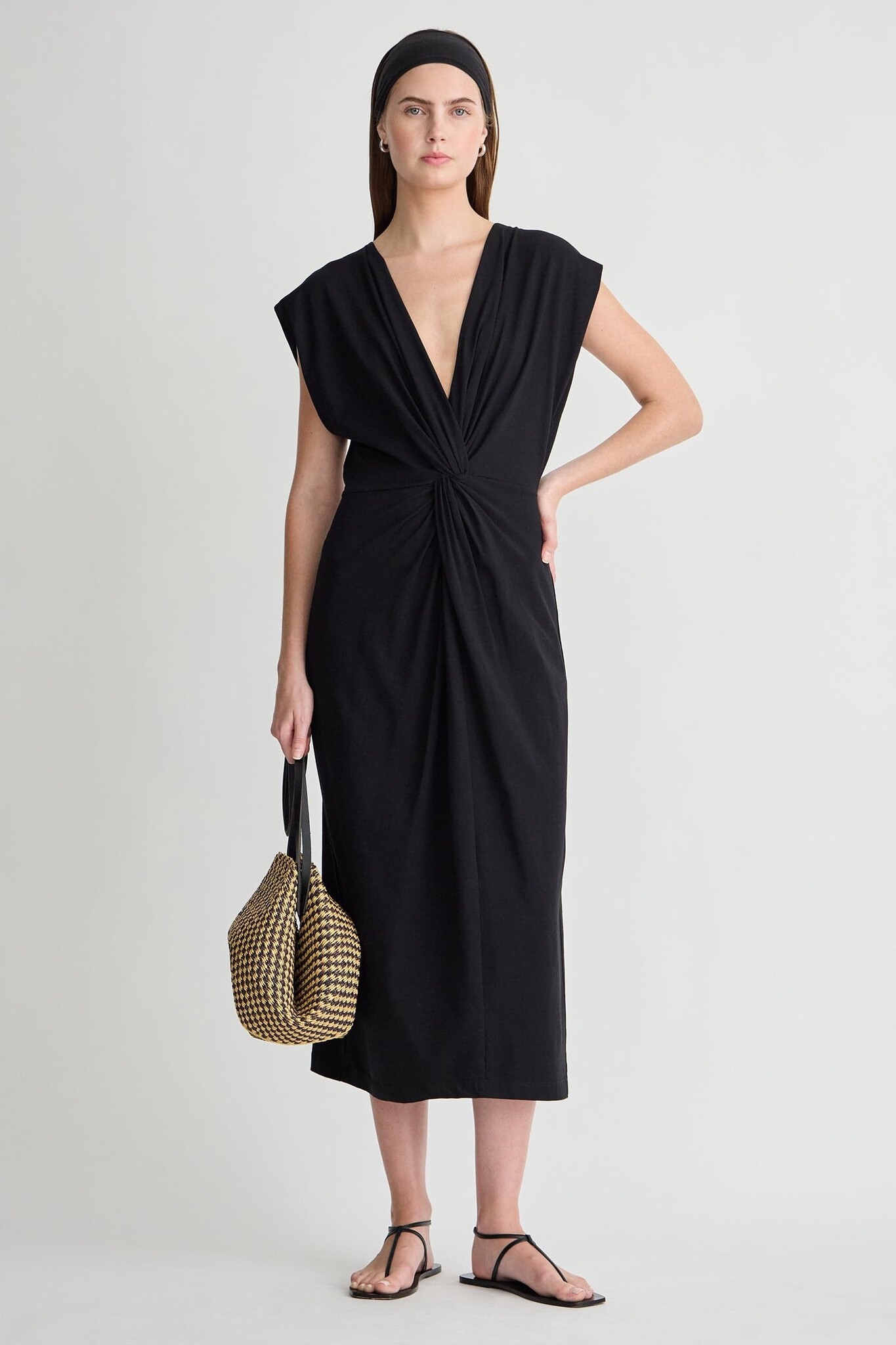 - V-neckline, twist detail at front waist, sleeveless arm holes