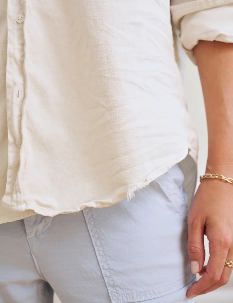 Create an account- Hand-distressed raw shirttail hem long enough to cover your bum