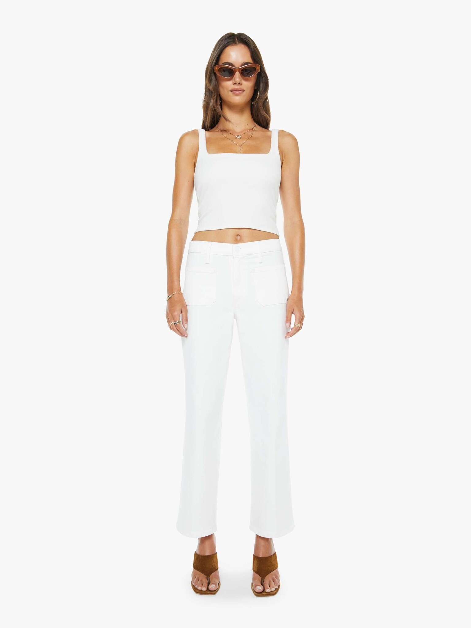 Mid-rise jeans with a loose fit, zip fly, wide leg, patch pockets and ankle-length inseam with a clean hem. Cut from semi-rigid SUPERIOR denim, Totally Innocent is a classic white with tonal hardware.