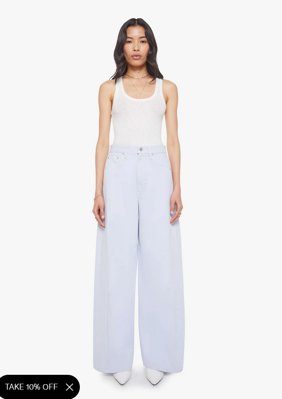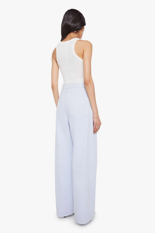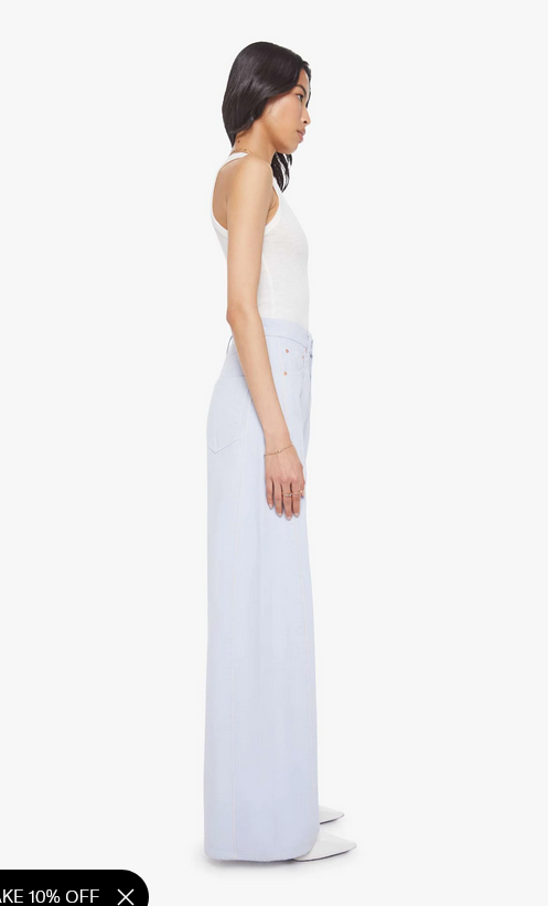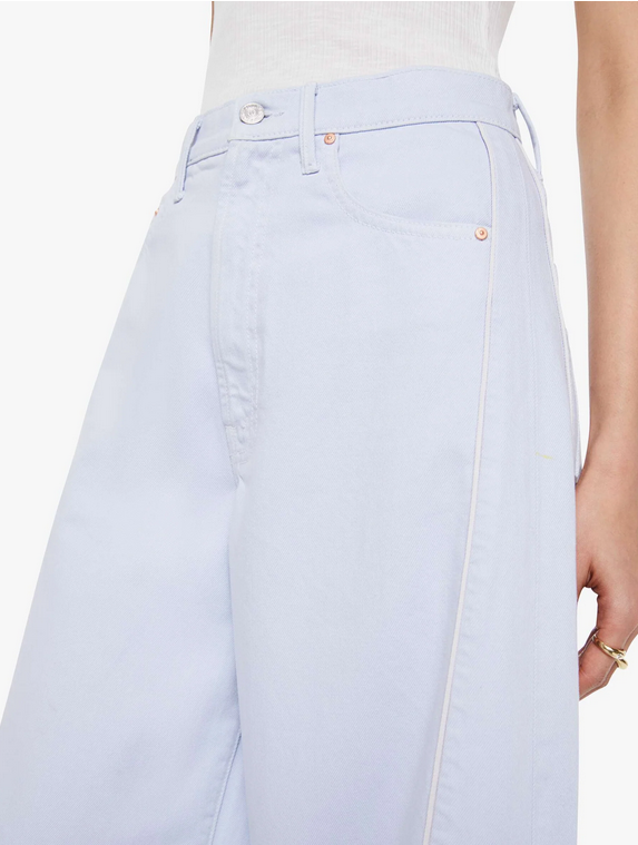 Super high-waisted barrel-leg jeans with a long 32-inch inseam, zip fly, clean hem and relaxed fit. Made from rigid SUPERIOR denim, Hit The Hay is a stone washed light blue with white piping down the outer seams.