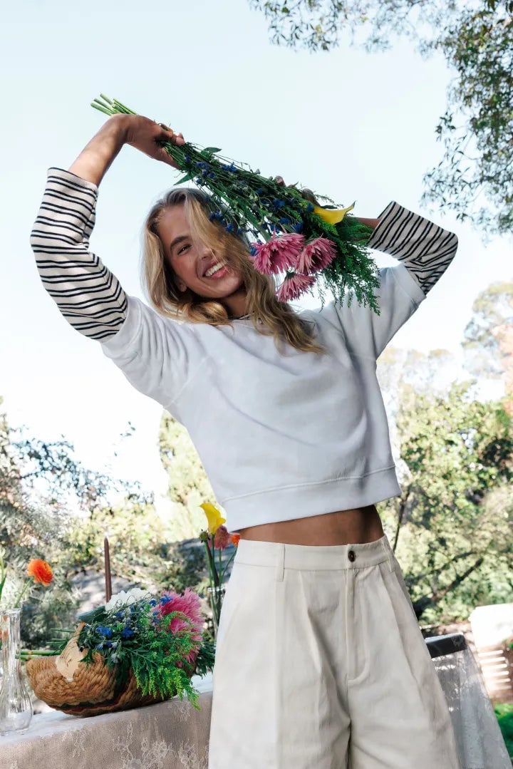 This sweatshirt takes our signature french terry and gives it a fun and feminine, structural twist. Designed with a relaxed body that balances the bubble sleeves and raglan seam for a statement layer with the wide rib that ties the whole top together.