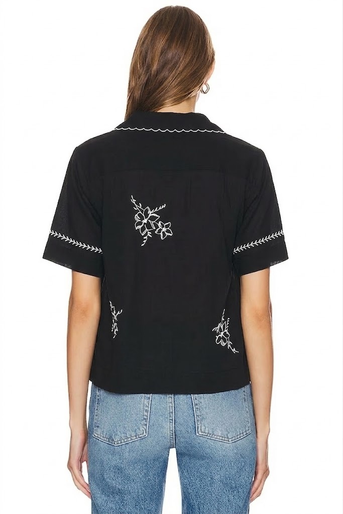 This classic short-sleeve collared shirt by The Great features a button-front closure and front patch pockets. With a boxy fit inspired by vintage bowling shirts, it’s reimagined with delicate Victorian-era handkerchief embroidery and scalloped edges.