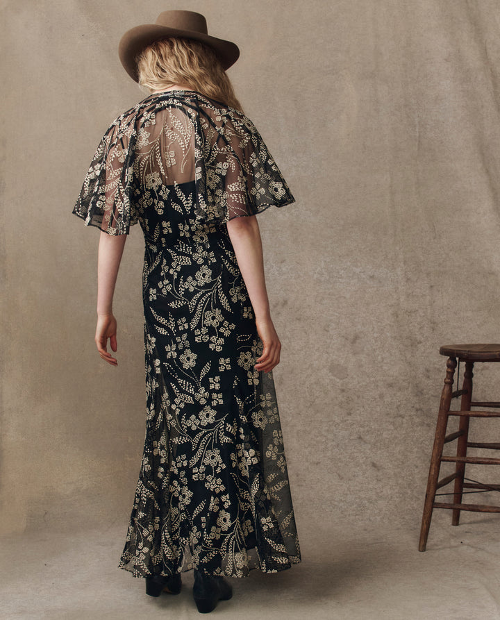 A romantic nod to the 1930s, reimagined for modern ease. This dress fits slim through the body with an empire waist and a softly flowing skirt that drapes from the waist to the sweep. The low V-neckline and flutter sleeves lend gentle movement.