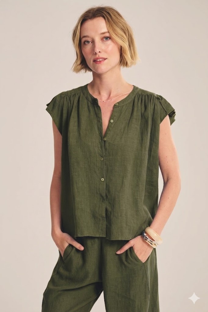 Crafted from breathable woven linen, this top offers a relaxed, airy fit perfect for warmer days. It features a button-front closure, flutter sleeves, and subtle pleat-rouched detailing along the front shoulders and back for added texture and movement.