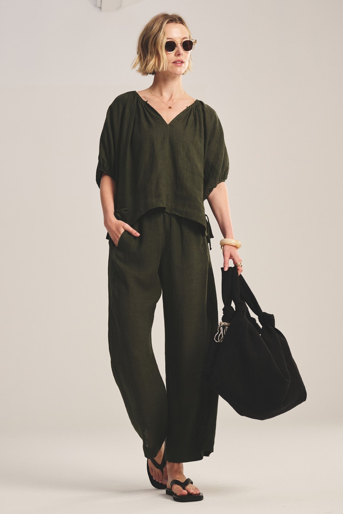 Crafted from lightweight woven linen, the Lola features a soft elastic waistband, relaxed straight leg, subtle ankle crop, and side seam pockets for everyday ease. This pull-on silhouette offers breathable comfort and a naturally flattering drape.