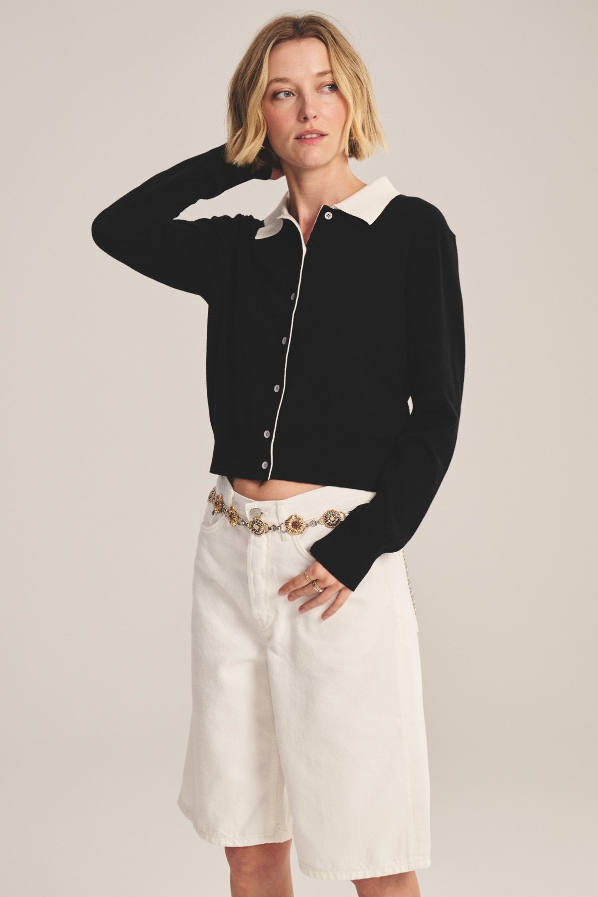 Elevate your wardrobe with this soft sweater polo cardigan, crafted from cotton-cashmere for lightweight warmth. Fitted, cropped with a button-front closure, contrasting collar and placket, and ribbed cuffs and hem for subtle structure.